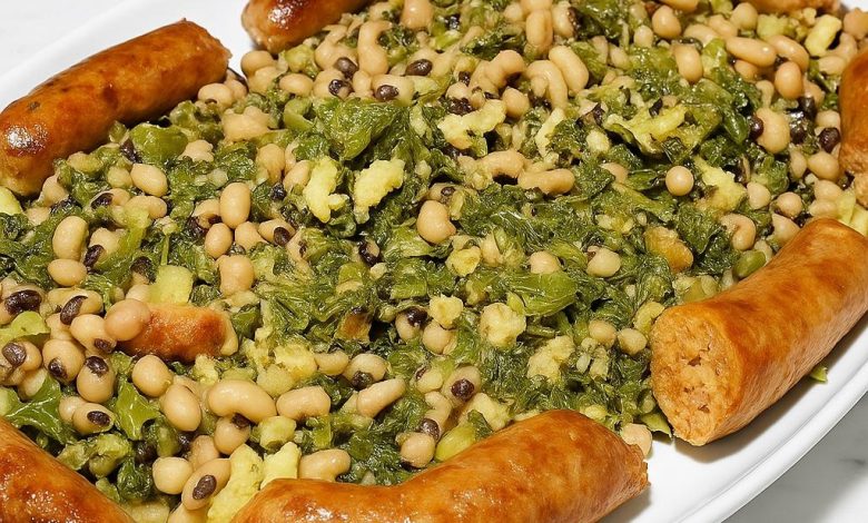 Alheira com Migas de Couve Feijão frade e Broa de Milho